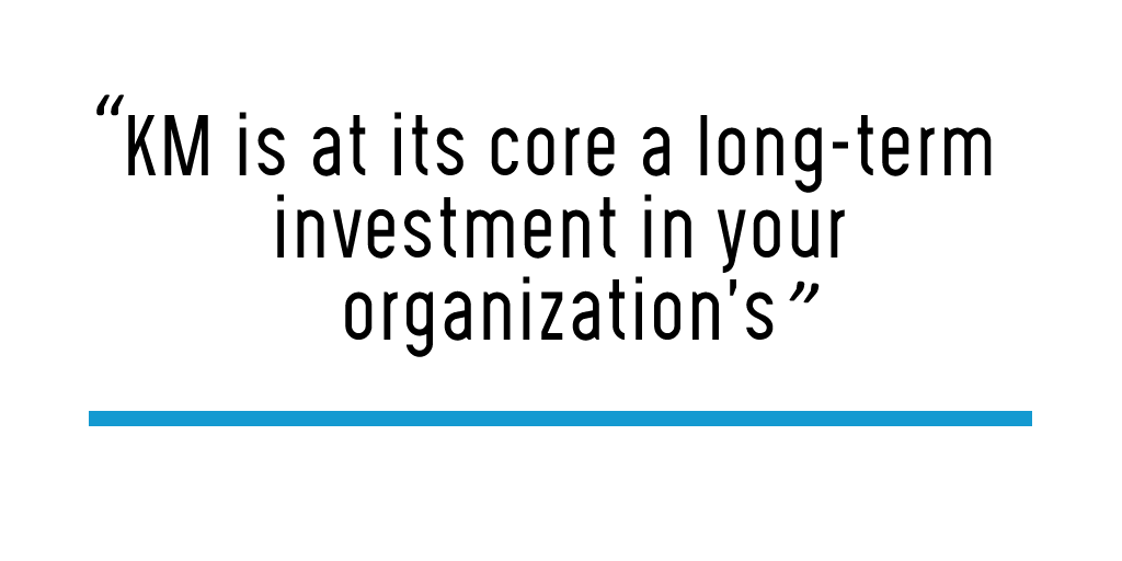 The problem is, even if you design your initial approaches around short-term returns, KM is at its core a long-term investment in your organization’s future. Some benefits accrue only when best practices or lessons learned are applied to new situations, which may take place years in the future. If leaders have a myopic view of what constitutes success (for example, if they require a measureable hard-dollar ROI in three or six months), then the program will stall before hitting its stride.